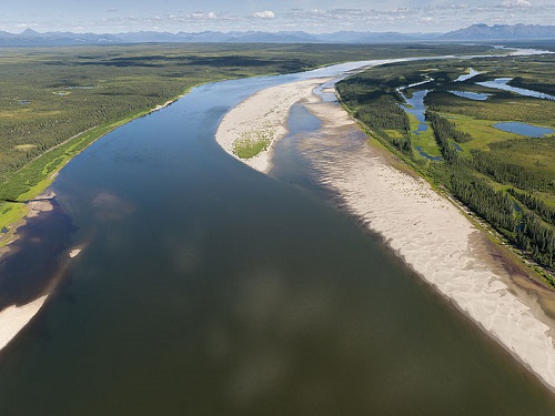 Kobuk Valley protects 61 miles (98 km) of the Kobuk River and three regions of sand dunes. Created by glaciers, the Great Kobuk, Little Kobuk, and Hunt River Sand Dunes can reach 100 feet (30 m) high and 100 F (38 C), and they are the largest dunes in the Arctic. Twice a year, half a million caribou migrate through the dunes and across river bluffs that expose well-preserved ice age fossils.