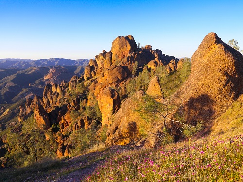 Named for the eroded leftovers of a portion of an extinct volcano, the park is famous for its massive black and gold monoliths of andesite and rhyolite, which are popular with rock climbers, and a hiker's paradise of quiet trails crossing scenic Coast Range wilderness. The park is home to the endangered California condor (Gymnogyps californianus) and one of the few locations in the world where these extremely rare birds can be seen in the wild. Pinnacles also supports a dense population of prairie falcons, and more than 13 species of bat which populate its talus caves.