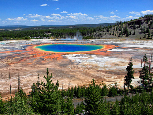 Situated on the Yellowstone Caldera, the park has an expansive network of geothermal areas including vividly colored hot springs, boiling mud pots, and regularly erupting geysers, the best-known being Old Faithful and Grand Prismatic Spring. The yellow-hued Grand Canyon of the Yellowstone River has a number of scenic waterfalls, and four mountain ranges run through the park. More than 60 mammal species, including the gray wolf, grizzly bear, lynx, bison, and elk, make this park one of the best wildlife viewing spots in the country.